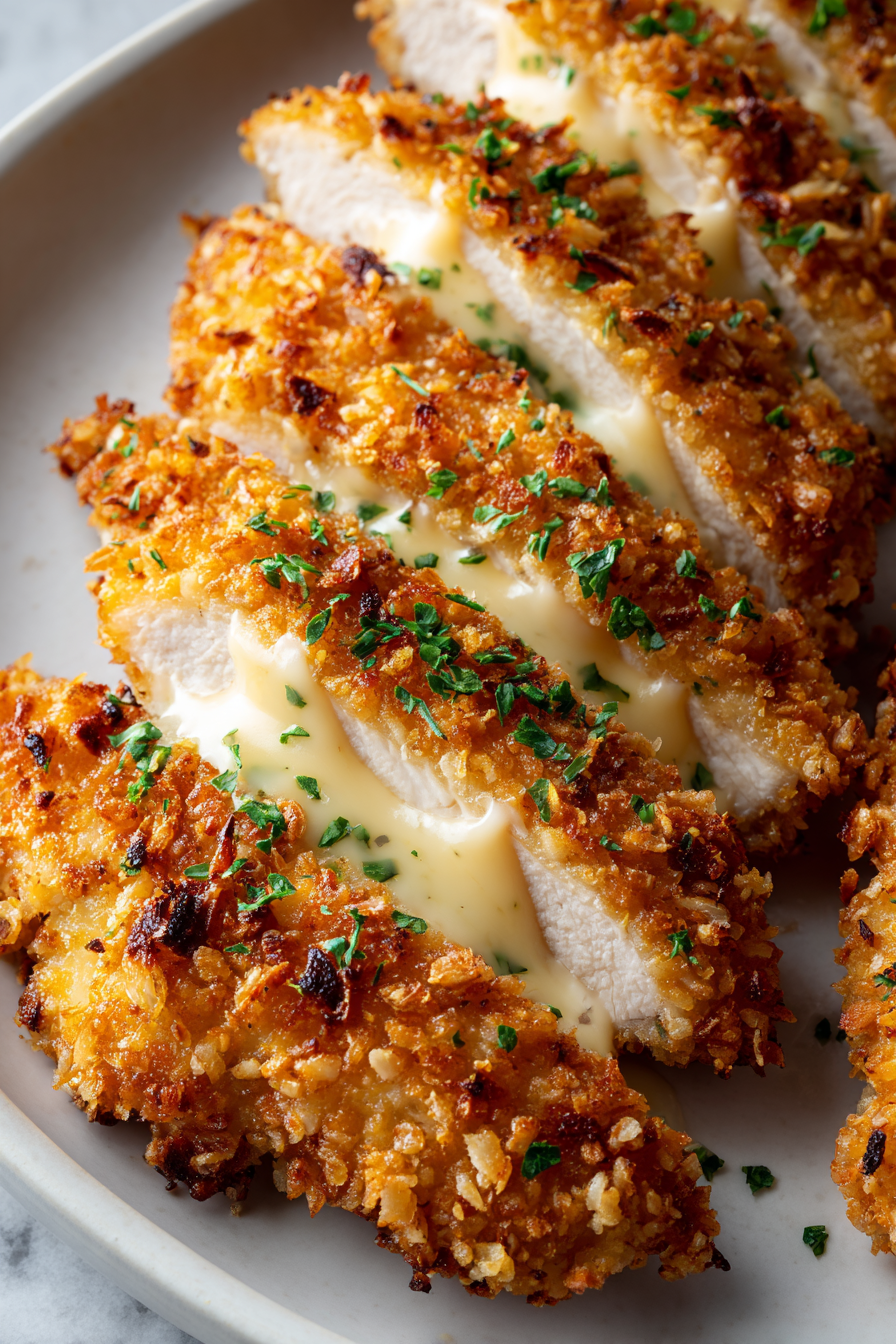 - Set up breading station: Arrange three shallow bowls in a row. First bowl: flour seasoned with salt and pepper. Second bowl: beaten eggs with a splash of water. Third bowl: panko breadcrumbs mixed with grated Parmesan, ranch seasoning, garlic powder, onion powder, and paprika.