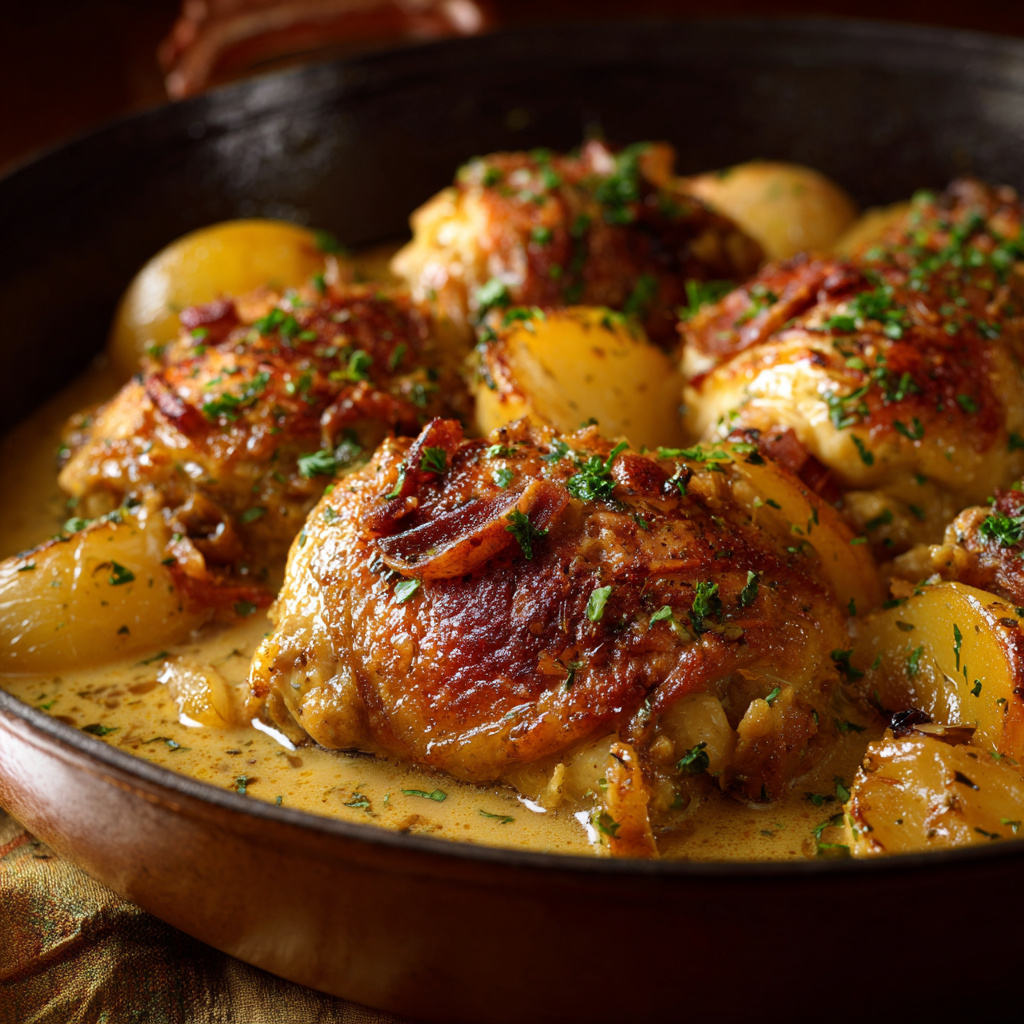 This beloved French comfort food combines savory and sweet elements in perfect harmony—tender chicken, smoky bacon, earthy herbs, sweet apples, and a rich creamy sauce infused with the complex flavors of dry hard cider. It’s the kind of meal that makes you want to slow down and savor every bite while pretending you’re dining at a countryside bistro in France.
