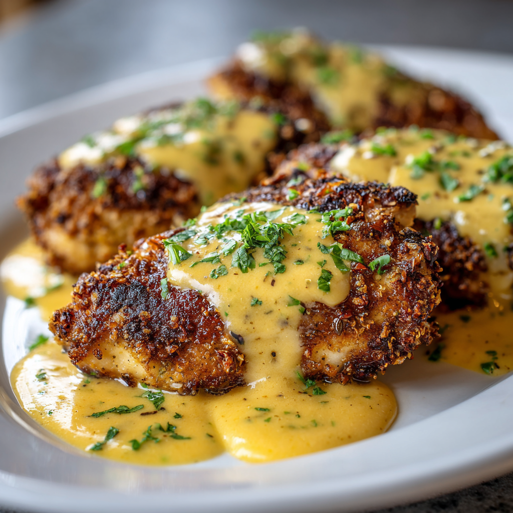 Step 13: Plate and Serve Transfer the crispy pretzel chicken to serving plates. Drizzle generously with the warm mustard-cheddar sauce or serve the sauce on the side for dipping. Garnish with fresh chopped parsley, thinly sliced red onion, and lemon wedges if desired. Serve immediately while the coating is at its crispiest.